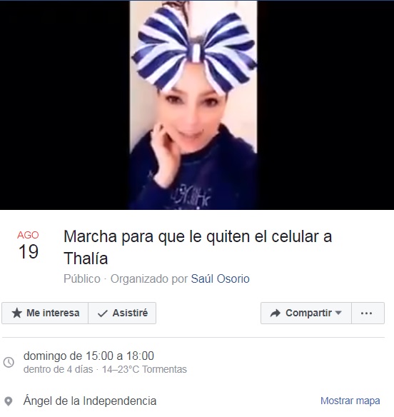 Usuarios de Facebook, que no les agradan sus publicaciones, han iniciado un evento llamado: Marcha para que le quiten el celular a Thalía, con su lema ¡Ya siéntese señora!, a modo de broma, pero el cual ya lleva 1.1 mil asistirán y 3.1 mil interesados.